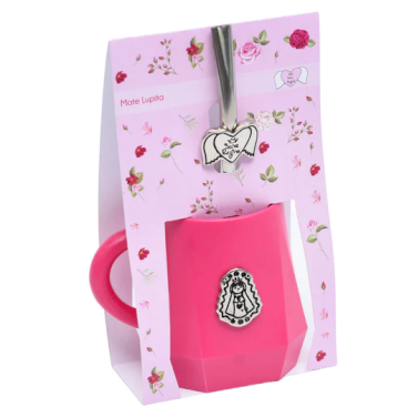 Mate plástico con aplique en metal de la Virgencita de Guadalupe. Mide 8 cm de alto y 5 cm de diámetro. Incluye bombilla easy clean con logo Salve Regina. Viene presentado en packing divino para regalo.