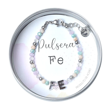 Pulsera de cristales mini y dijes de acero que forman la palabra Fe ❤ Viene presentado en una lata hermosa. con tarjeta con frase "Que tu fe sea más grande que tu miedo". Medida: 18 cm y cadena extra para extender. Packaging perfecto para reutilizar.